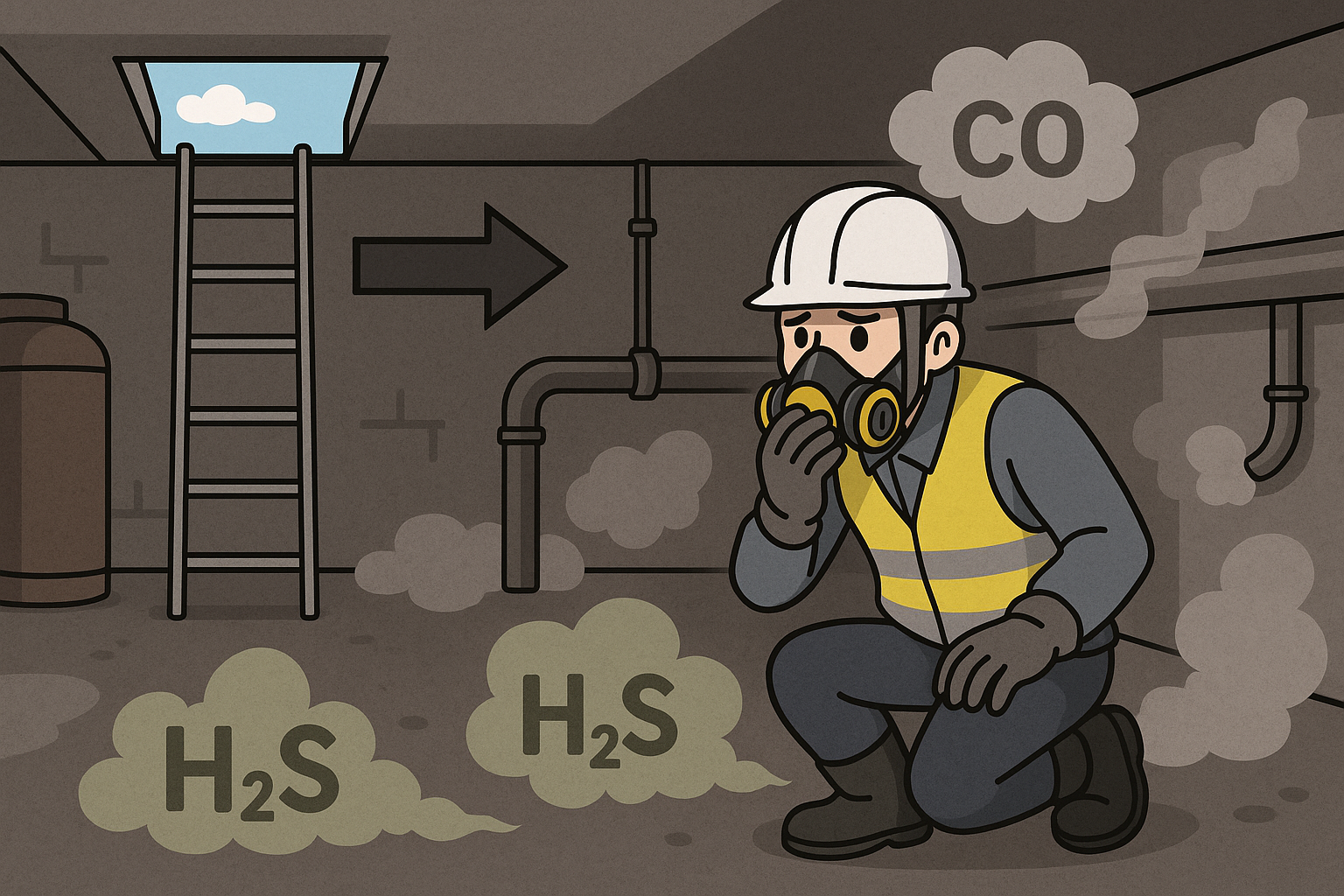 硫化水素は「腐った卵の臭い」で知られる有毒ガスで、比重は空気より重いため低所に溜まります。地下ピット・マンホール・下水道などでの事故が多く報告されています。