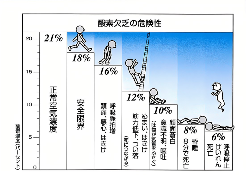 - 対策:作業前の酸素濃度チェック、自給式呼吸器の着用