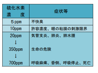 - 特徴:腐卵臭→高濃度になると嗅覚麻痺